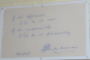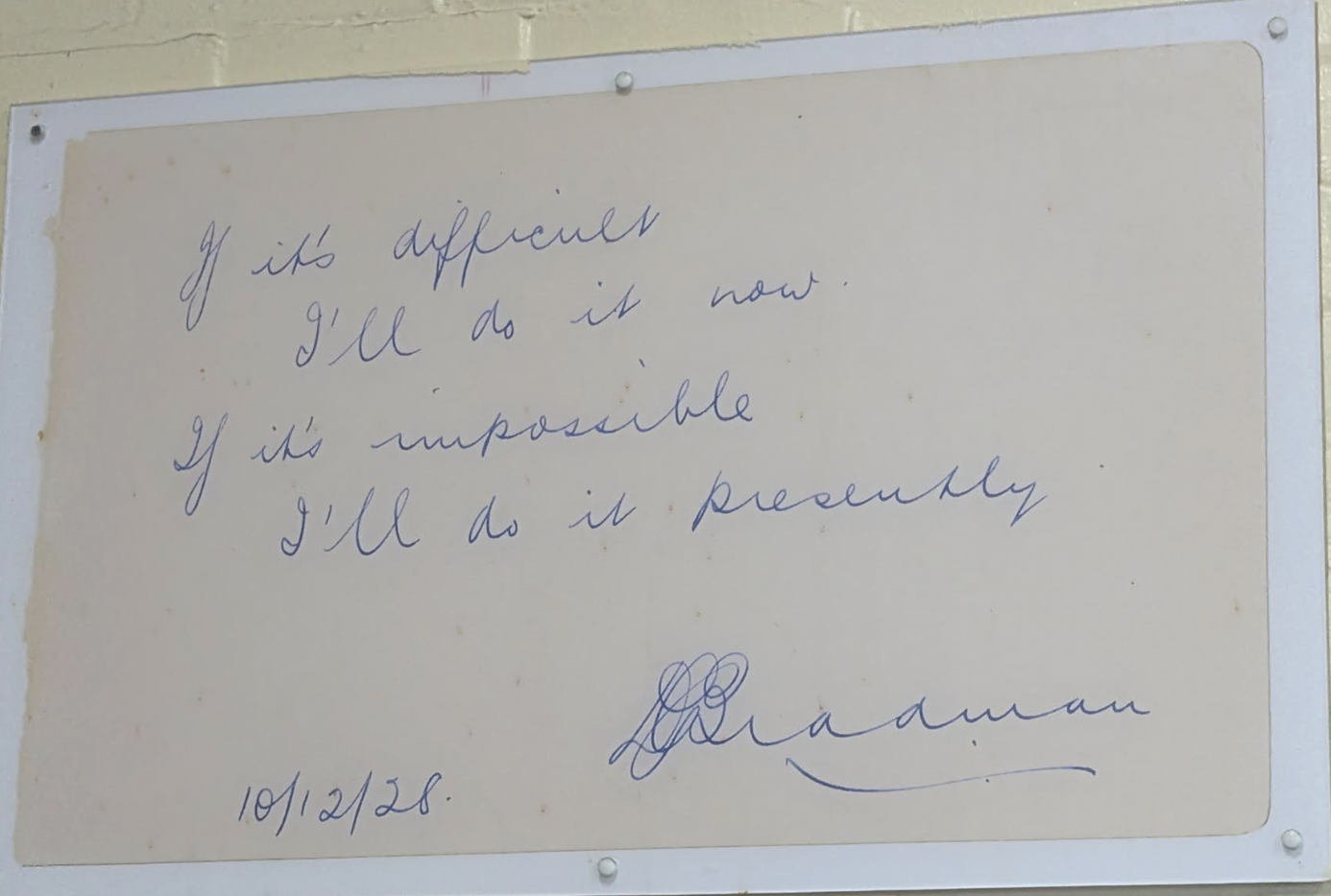 My favorite piece of nostalgia was a piece of yellowed paper, slightly larger than a placemat, displayed proudly and prominently above the doorway to be seen when exiting the home dressing room. It is a note, protected behind glass, handwritten by Sir Donald Bradman, the Babe Ruth of Australian cricket players. In easily legible cursive, in blue ink, with his underlined one-word signature “DGBradman” and date “10/12/28” at the bottom, it reads: