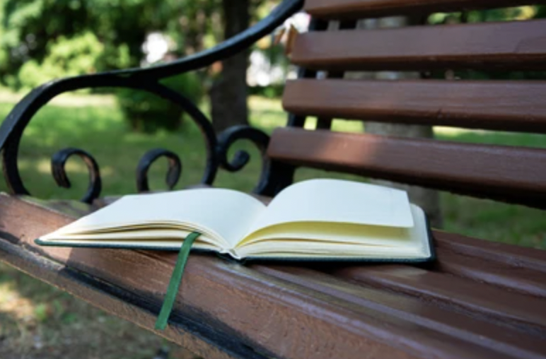Along the footpath are numerous wooden benches, all on the eastern side and facing toward sunset, most with memorial plaques on the backrests. On this recent morning, azure-skied and summertime-warm by 10 o’clock, one of the benches caught my attention. Specifically, I noticed a book resting on the slatted seat, all alone, its owner apparently having stepped away for a moment or, perhaps, accidentally forgot it behind entirely.